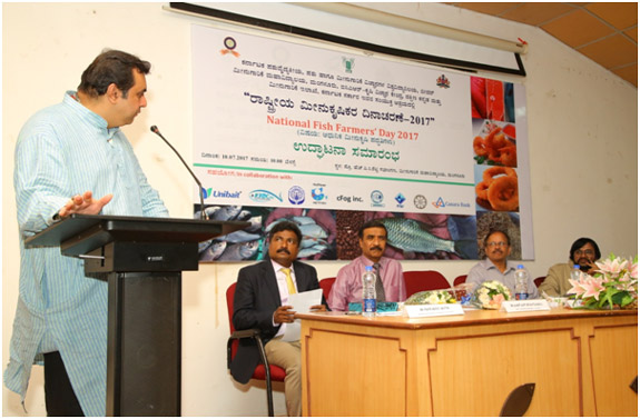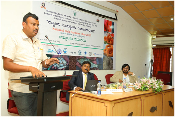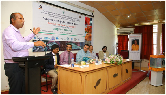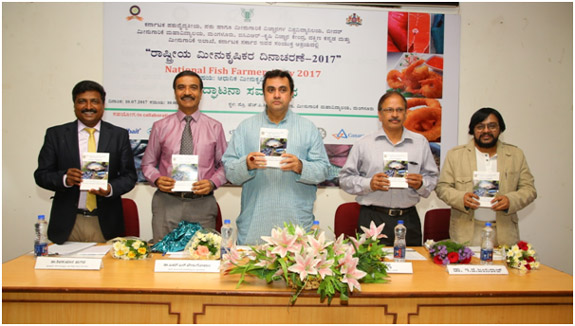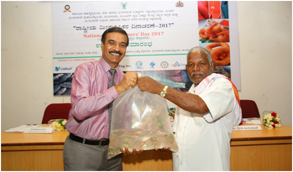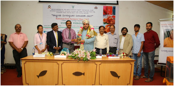 College of Fisheries, Mangalore, ICAR-KrishiVigyan Kendra, Dakshina Kannada and Department of Fisheries, Government of Karnataka jointly organized a “National Fish Farmers’ Day 2017 ” at Prof. HPC Shetty Hall, College of Fisheries. There were 120 farmers from different parts of Karnataka registered for the said program. Sri PramodMadhwaraj, Minister for Fisheries, Sports and Youth Affairs, Government of Karnataka inaugurated the program by releasing the Amur carp into aquarium. Minister said Government is framing a separate fisheries policy which will be implemented soon. He also insisted to take up more research on fish culture in saline and alkaline soils. The book edited by Dr Jayraj E G, Professor and Head, Department of Aquaculture and Dr ShivakumarMagada, Professor and Head, ICAR-KVK, Dakshina Kannada entitled “Modern Aquaculture Techniques”written in Kannada language was also released by the minister. Dr M NVenugopal, Dean, College of Fisheries, Mangalore presided over the function. Mr V K Shetty, Managing Director was the chief guest. Dr Jayaraj welcomed the gathering. Dr ShivakumarMagada presented a concept explaining the purpose of celebrating fish farmers’ day. Mr Mahesh Kumar, DD, Department of Fisheries proposed vote of thanks. Minister was felicitated by COFAA and thanked the minister for taking action for filling 42 Asst. Director of Fisheries posts in the department. The MD of KFDC Mr V K Shetty was also felicitated since he is superannuating 31st July 2017. Famers were given “Aquakit” containing fish seed, feed, pH paper. Integrated farmers were given Swarnadhara breed of backyard chicks developed by Karnataka Veterinary, Animal and Fisheries Sciences University (KVAFSU), Bidar.