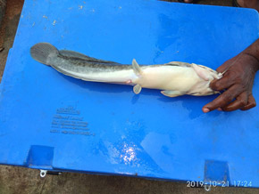 Taxonomical Identification of fish samples are based on standard taxonomical keys and the characteristics are - Body elongate, Head large, depressed and bony with small eyes. Narrow and angular occipital process; gill openings wide; cleithrum pointed, narrow with longitudinal ridges and with sharpness. Mouth large and terminal, 4 pairs of barbels present. Long dorsal and anal fins; without dorsal fin spine and adipose fin. Anterior edge of pectoral spine serrated. Caudal fin rounded. Body colour gray to olive with dark greenish; brown markings, belly white.