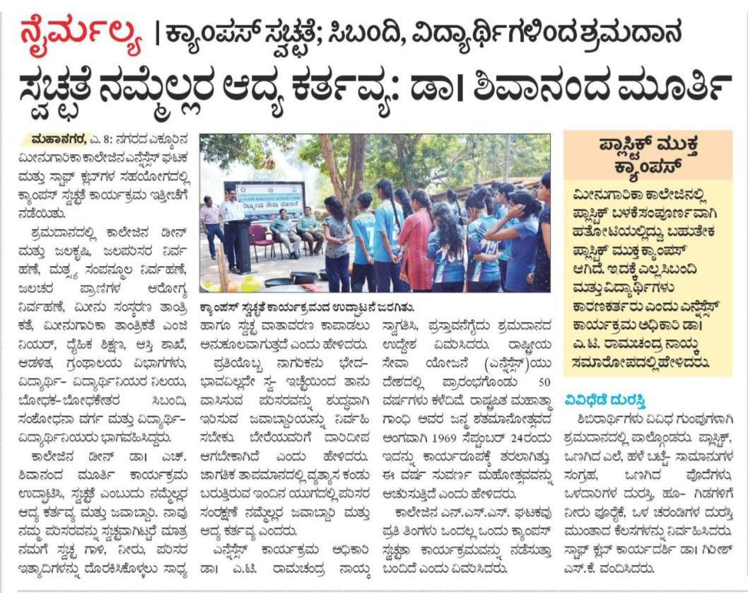 Keeping in view the above and the initiative taken by Hon’ble Prime Minister Shri Narendra Modi with regard to Swachtha Abhiyan the College of Fisheries, Mangaluru (CoFM), undertook the above campaign. CoFM undertakes research and academics in developing fish and fisheries in the country and also promote Conservation and Protection of the Aquatic Environment including the marine habitat.