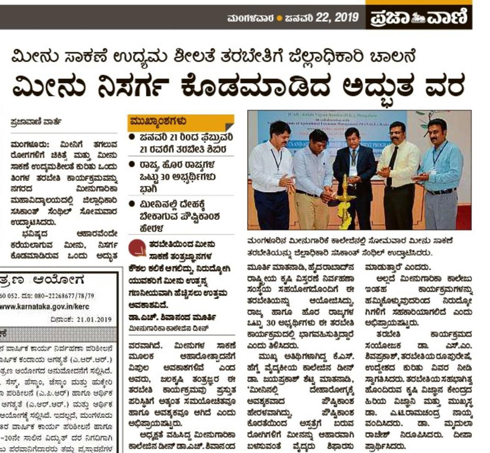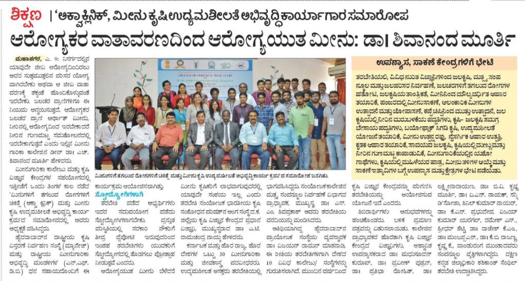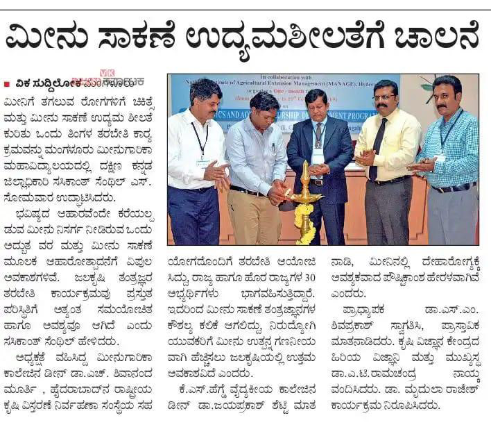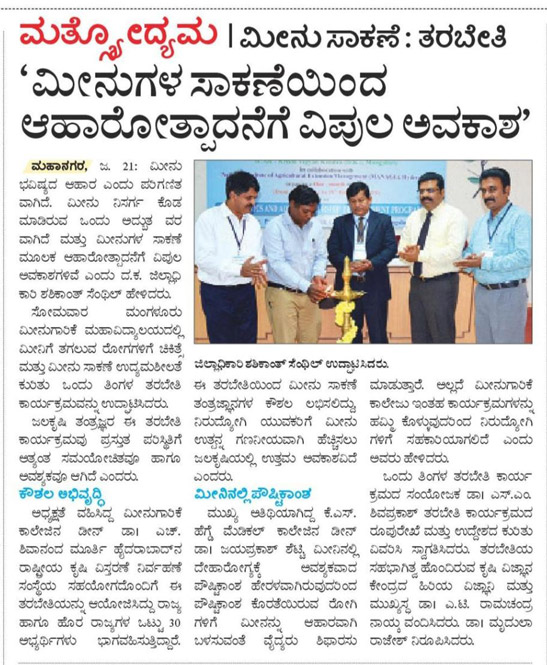 Dr. Pravin Puthran, Asst. Director General ICAR was the inaugurator. Dr. Madhusudhan Kurup, Chairman of CIFRI Barakpur (Research Advisory Committee) was the Chief guest. Dr. A. M. Ramesh, Chief executive officer KSTA was the guest of honor. Dr. H. Shivananda Murthy, Dean (Fisheries) presided the programme.