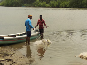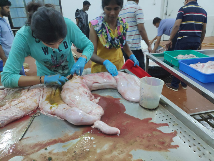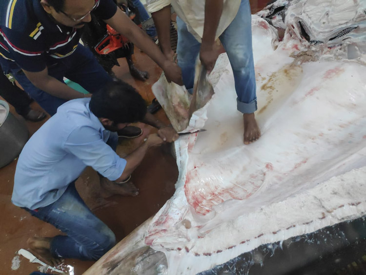 Its gut content primarily consisted of a large amount of sand and shells. From the texture of the sand, it is possible that the animal gulped the sand from the water along the shores of Surathkal. The stomach was almost empty and contained a little amount of some semi-digested matter which has been taken for further studies. All its other organs — liver, pancreas, heart, gills and gall bladder etc. were weighed, measured for length, and stored in refrigerated conditions for further studies. No internal injuries were found. It was a male.