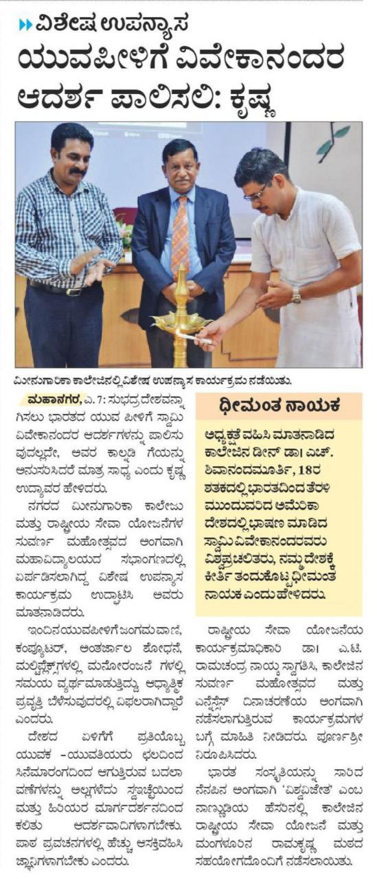 The lecture was delivered on 4th April, 2019 at 3.00 PM at Prof H.P.C. Shetty hall by Mr. Krishna Updhyaya, Ramakrishna Mission, was helpful to the modern younger generation to appreciate the life giving message of Swami Viviekananda and to inculcate the same in their life and to contribute towards national development.