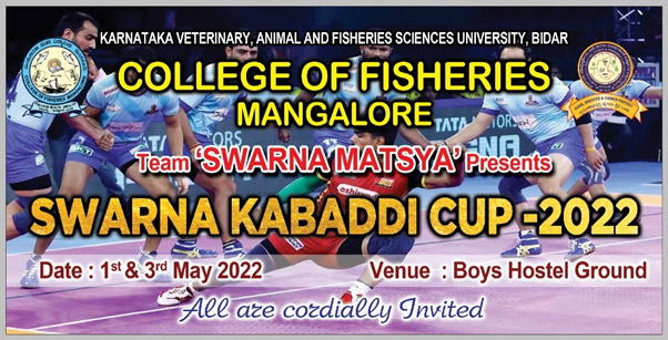 - The Sport event ‘Swarna Kabaddi Cup 2022’ was conducted from 1st to 3rd May 2022 at boys’ hostel ground on the eve of Basava Jayanti. The tournament was organized in a professional way by the batch ‘SwarnaMatsya’ [IV BFSc students].