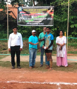 On the occasion of Republic Day celebration, Khel Kabaddi Republic Day Cup 2023 was organized by Marine Marcels in a befitting manner. The Khel Kabaddi Republic Cup was inaugurated by Dr. Dinesh Kaller, Joint Director (Marine) and MD, KFDC, Mangalore and Captain Jaya Prakash Mendon graced the occasion as chief guest. Dr. Shivakumar M, Dean, College of Fisheries, Mangalore presided over the function. Mr. Manoj Kumar, Asst. Professor and Head, Dept. of Physical Education coordinated the programme. A total of five teams participated in the Khel Kabaddi Republic Cup and went on for the whole day. The final match was held between Aqua Tridents and Ocean Samaritans at 5.00 pm. Ocean Samaritans won the match with Mr. Aravind getting the highest raid points while Mr. Vijay getting highest tackle points. The prizes for winners and runners were distributed by Dr. Praveen Puthran, retired ADG, ICAR, New Delhi and Captain Jayaprakash Mendon.