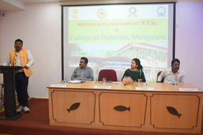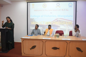 An Induction cum Orientation program for newly admitted B.F.Sc. students to College of Fisheries, Mangaluru was organized on 16th January, 2023 at Prof. H.P.C. Shetty seminar hall at 2.00 pm. Mrs. Nayana Shetty, former Radio Jacky of Red FM, Mangaluru, currently working as Freelancer at Audiobook Companies of Kuku FM and Pocket FM was the Chief Guest for the program. She addressed the freshly joined students on selecting the professional course and building their career. She also stressed on dreaming to achieve and succeed in the field of ‘fisheries’. Dr. Shivakumar M., Dean of the college in his presidential remarks gave the importance of fisheries education. Dr. H.N. Anjanayappa, Head of Division and Head of Dept. of Fisheries Resources and Management was the guest of honour during the occasion. Dr. A.T. RamachandraNaik, i/c Assistant Registrar and Professor of Dept. of Aquatic Environment Management welcomed the guests, faculty members, freshly joined students and their parents and organized the duel programs.