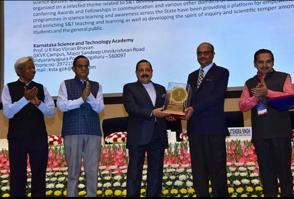 Dr Ramesh A. M. Chief Executive Officer at the Karnataka Science and Technology Academy (KSTA), Bengaluru has been conferred with the prestigious “National award for outstanding efforts in S&T Communication” from the National Council for Science and Technology Communication (NCSTC). He is an Alumnus of college from the 1982 batch of B.F.Sc. and he received this award on February 28, 2023 from Dr Jitendra Singh, Union Minister of Science & Technology on 28-2-2023.