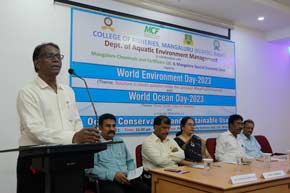 Dr. V. Karikalan, I.F.S., Conservator of Forests, Mangalore inaugurated the program and appraised the gathering of the activities and the efforts put forth by the Forest department on the aquatic environment and associated World Bank project. Dr. Dinesh Kumar Y. K., I. F. S. Deputy Conservator, Dept. of Forest, presided over the program. The program was followed by a technical session with renowned speakers like Dr. Dinesh Babu, Principal Scientist, CMFRI Mangalore who spoke on the topic “Aquatic animal diversity in marine and coastal waters of Karnataka”; Dr. Shivakumar Magada, Dean, College of Fisheries gave “An overview of Aquatic Environment”; Dr. Sujitha Thomas, Principal Scientist, CMFRI Mangalore briefed on the “Conservation of Marine Aquatic Organisms”; Dr. Ashwin Rai, Director, Aquatic Biosystems, spoke on the topic “Conservation of Western Ghats Riverine Fishes” and Ms. Tejaswini, Member of Reef Watch Mangalore spoke on “Marine Animal Stranding and Ghost Net Awareness”. A documentary film prepared on Coastal and Marine Biodiversity by the Department of Forest under the theme “JEWELS OF COAST” was screened during this occasion. The program was represented by the officers from Coast Guard Mangalore, Coastal Police Security, and the Department of Fisheries, GOK. The students from the College of Fisheries also participated in the program.