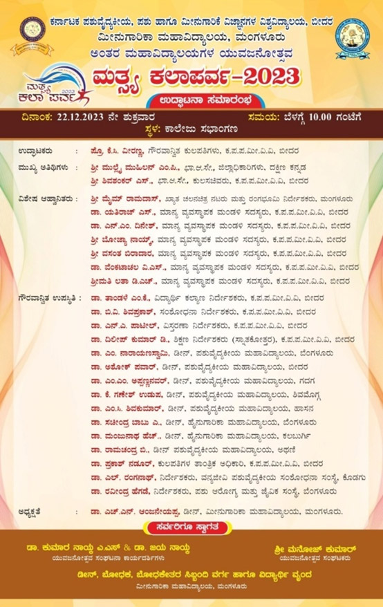 KVAFSU - College of Fisheries, Mangaluru, hosted the 17th Intercollegiate Youth Festival, "Matsya Kalaparva 2023" in the College Auditorium from December 22nd to 24th, 2023. 8 constituent colleges of the prestigious Karnataka Veterinary, Animal and Fisheries Sciences University (KVAFSU) participated in the event.