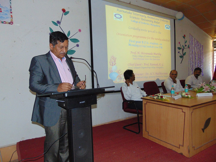 The programme begun by welcoming the guests, then invocation followed by the lighting the lamp by dignitaries. Dr. H. Shivananda Murthy, Dean(Fisheries) presided the function and congratulated the students on obtaining admission in the college. He also informed the students about the code of conduct and briefed about the glorious college history and the facilities available in the college for the overall growth of the students.